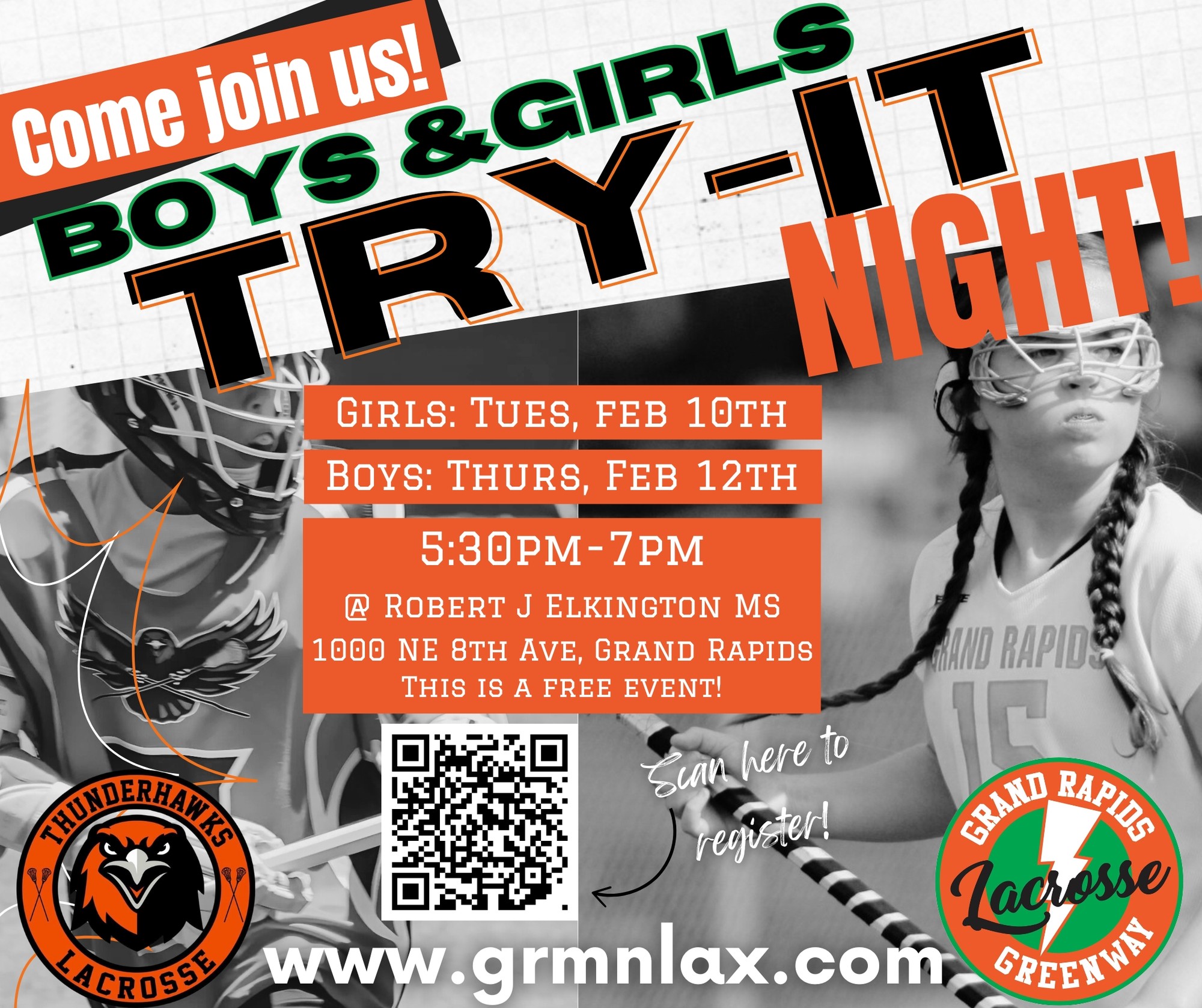 Come join us for a FREE try lacrosse event with Grand Rapids Amateur Lacrosse Association at Robert J Elkington Middle School in Grand Rapids on February 10th for girls, and boys February 12th from 5:30 to 7:00. Come on out!